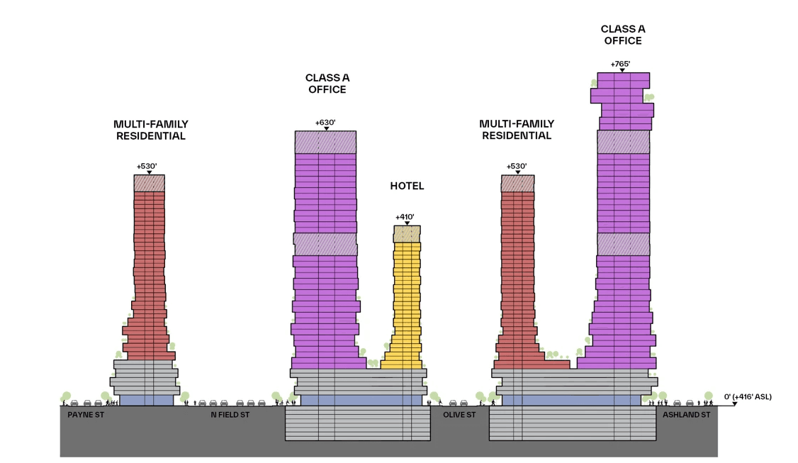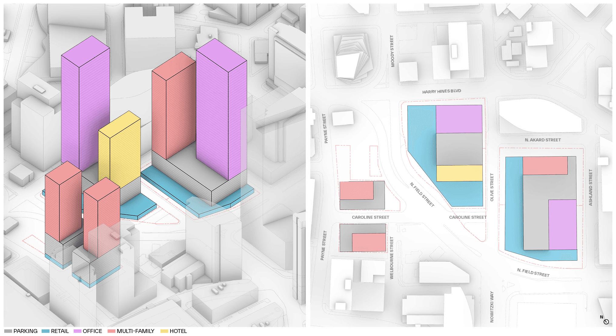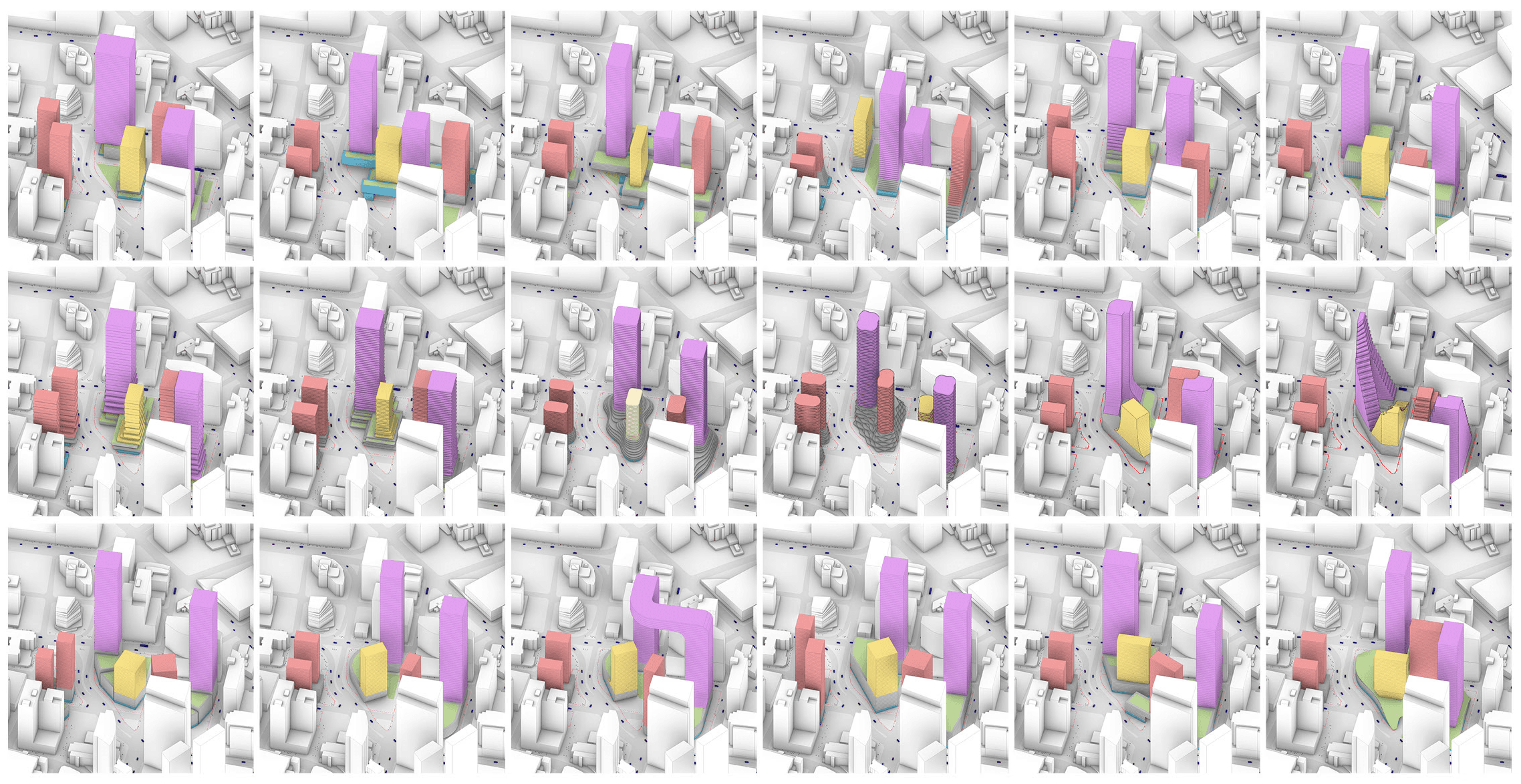 Although the process spanned just three weeks, the design team worked efficiently to articulate the architectural vision in as much detail as possible, giving the client a clear sense of how the development could evolve over time. Visualizations and analyses were crafted to convey both the overall scale of the project and the human-scale placemaking at its core. This design work was complemented by technical studies, including preliminary planning strategies and development metrics to support early pricing and feasibility assessments.