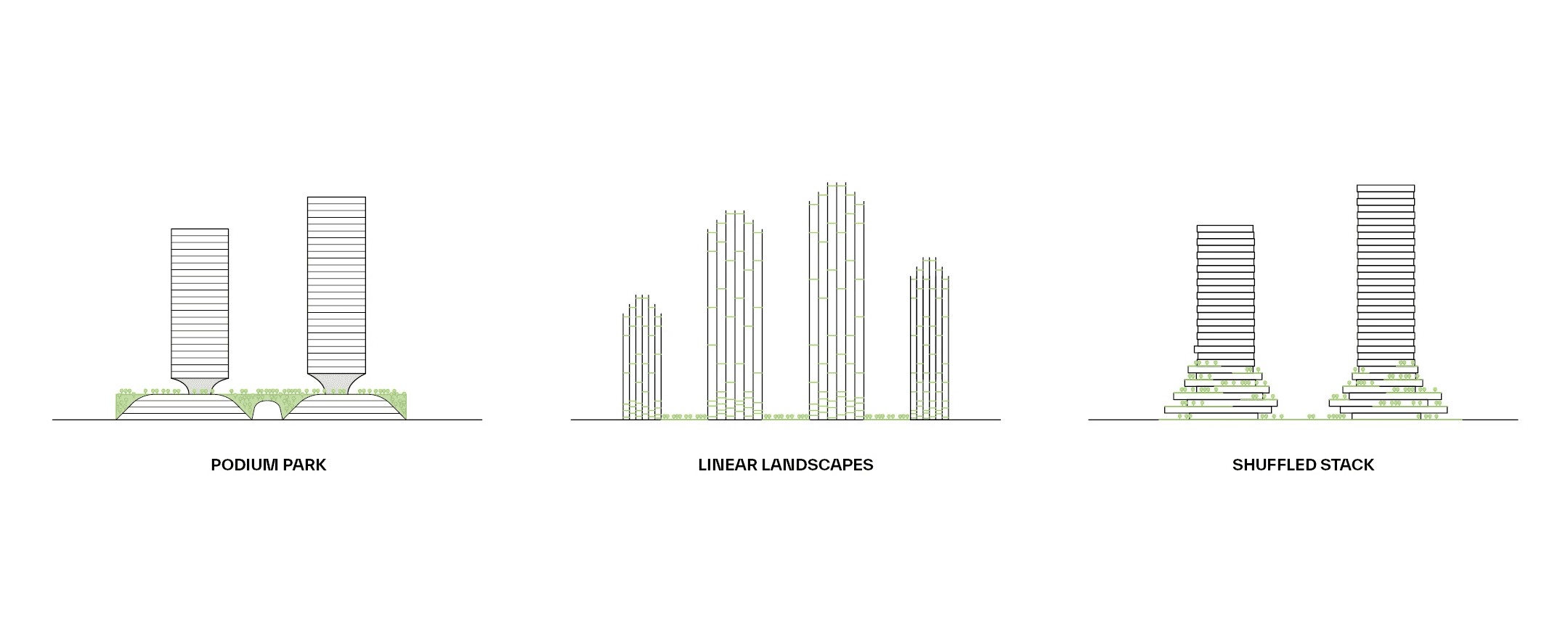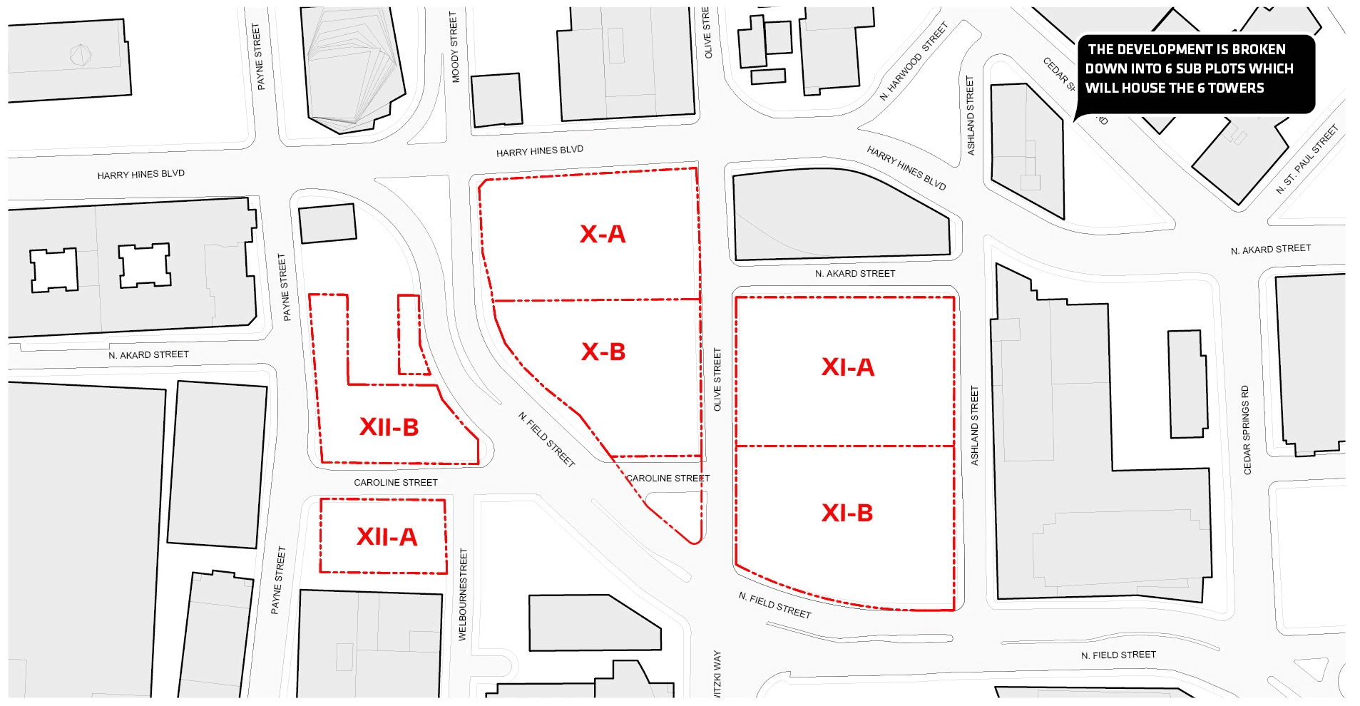 Following a thorough site analysis, the team took a deeper dive into the programmatic requirements and how they would be distributed across the various plots. Given the planned density of the development, one of the key challenges was finding a way to make the project feel effortless, inviting, and approachable. Through an iterative process of massing studies and analysis, the team developed a range of options that met the programmatic needs while also establishing a foundational framework for the district’s design language and conceptual direction.