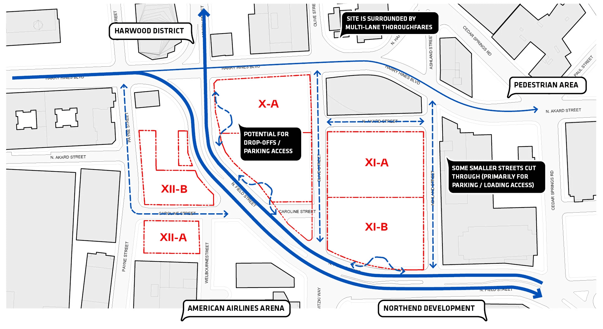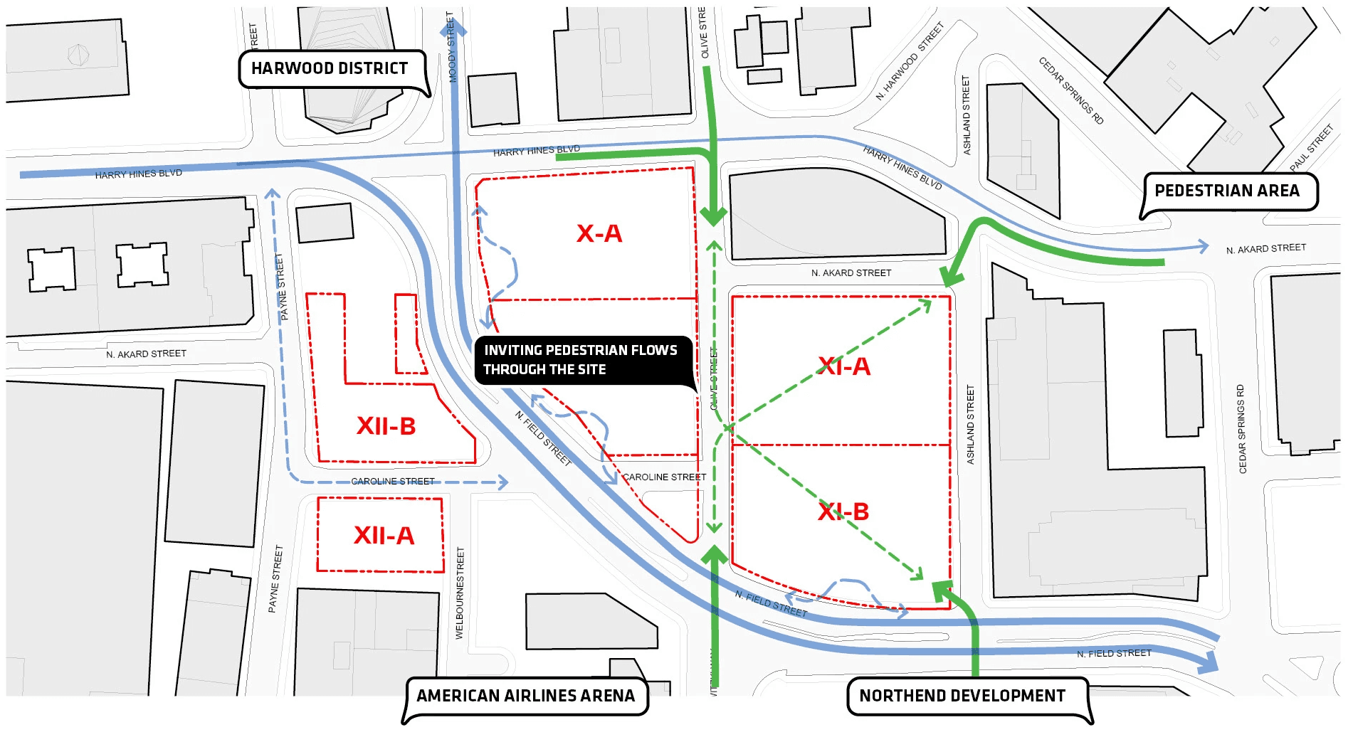 Before exploring massing strategies, it was essential to develop a clear understanding of the site and its surrounding constraints. The future development was planned to span three separate parcels, each divided into two smaller plots. Understanding adjacencies and connections was a critical first step, followed by an analysis of vehicular and pedestrian flows to determine how users would arrive at and move through the site. From the outset, the design approach prioritized integration with the existing pedestrian network, avoiding any sense of isolation from the surrounding district.